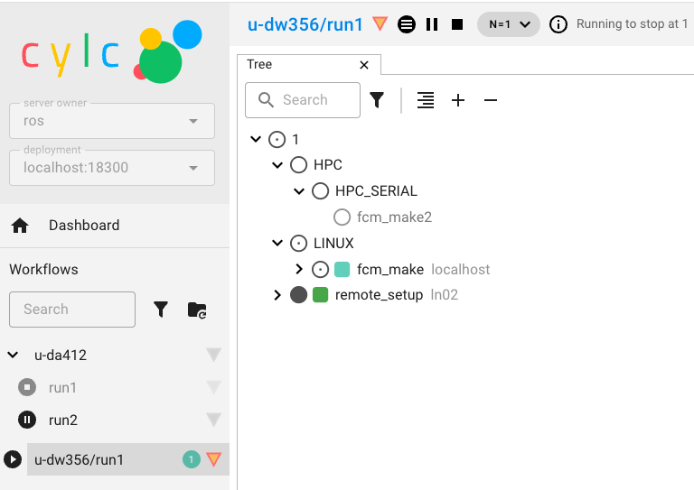 The Cylc GUI is a monitoring and control application that runs in a web browser. The Cylc GUI has different views you can use to examine your workflows, including a menu to allow you to switch between workflows. You only need to have one instance of the Cylc GUI open.